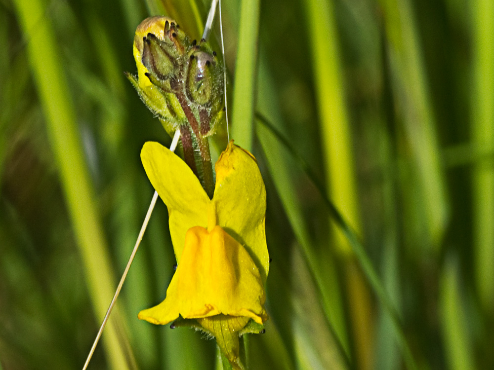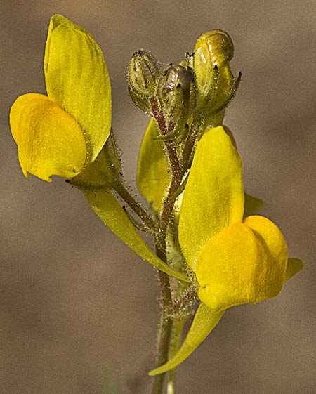 Hierba anual de no mucho porte. Los tallos son fértiles y erectos de hasta 60 cm de altura, aunque generalmente no sobrepasan los 40 cm, glabros en la parte inferior y, a veces, glandular pubescentes en la inflorescencia. Las hojas son alternas, lineares o filiformes, de hast 4 cm de longitud. Inflorescencias en racimos laxos al final de los tallos que despenden un olor dulzón; las brácteas son lineares y obtusas, los pedicelos están en la antesis y son erectos, no adnatos al eje de la inflorescencia. Cáliz de unos 4 mm, con los lóbulos oblongo-lanceolados; corola bilabiada de forma muy característica, de color amarillo intenso, de 15-30 mm de longitud, con un largo espolón recto o un poco curvado de 9-18 mm. Fruto en cápsula de unos 4 mm. Semillas en disco casi negro.