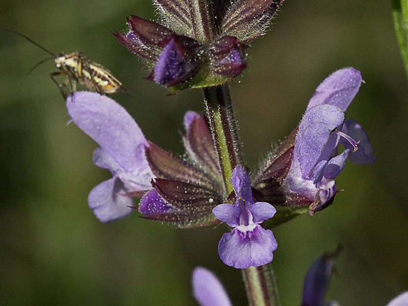 Tienen un mecanismo de polinización muy especializado. A diferencia de otros miembros de la familia de la menta, las salvias solo tienen dos estambres. Sus anteras están divididas en dos partes muy diferentes: una soporta los filamentos que contienen el polen, que están protegidos por el labio superior de la flor; la otra parte se ha extendido en una lámina similar a una espada que tiene la función de cerrar el tubo parcialmente y recibir a los abejorros cuando empujan su probóscide para alcanzar la reserva de polen. Si un insecto toca esta lámina, los filamentos en el otro extremo de la estructura se mecen hacia adelante y tocan el dorso del insecto. En la siguiente flor, este polen con suerte acabará en el estigma, que sobresale claramente de la corola. Es muy apreciada por la abejas y produce una miel con sabor y olor característicos.