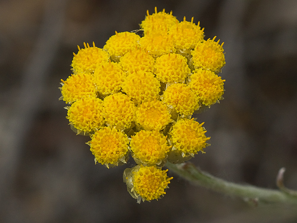 La Helichrysum stoechas es una pequeña planta herbácea, aunque a veces de base leñosa, con los tallos erguidos creando una forma arbolada, que puede alcanzar hasta los 60 cm de altura. Hojas alternas, simples, enteras, vellosas, estrechas, lineares, con el borde enrollado, de color grisáceo, tomentosas, y al ser frotadas despiden un fuerte olor a la vez que pierden los pelillos. Las inflorescencias son amarillas en cima densa formada por cinco omás capítulos solitarios o agragados en corimbos, de aspecto pajizo amarillento, reunidos en grupos en el extremo de los tallos. Inflorescencias rodeadas por brácteas ásperas, espatuladas las interiores y ovales las exteriores. Las flores son flosculosas y amarillas, las externas femeninas y las internas hermafroditas. El fruto es un aquenio pardo oscuro con glándulas blanquecinas provistoas de vilano. Es hermafrodita.