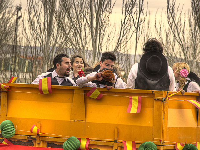 El evento hubo de empezar puntual pues, aunque llegué, a las 15:20, hubo quintos a quienes no vi pasar bajo los palos . La mayoría de los quintos corrían los gallos, como viene siendo habitual en estos tiempos mecanizados, a lomos de un remorque del que tiraba un potente tractor y sólo dos de ellos hacían las carreras a caballo, a la manera tradicional de antaño. |